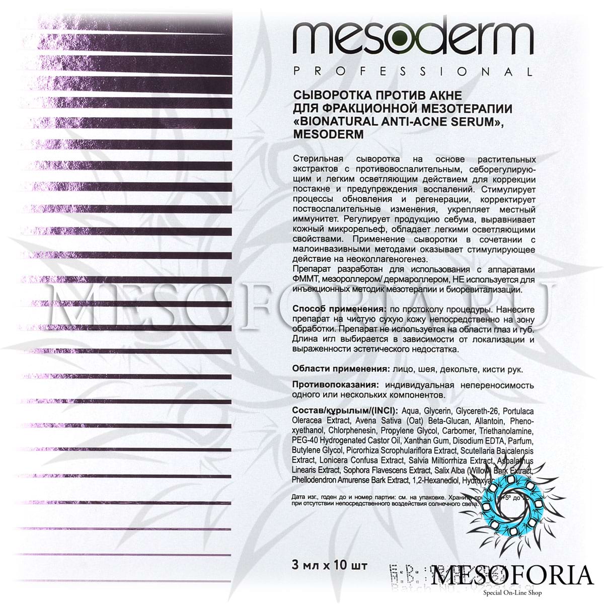 Сыворотка против акне для фракционной мезотерапии / Bionatural Anti Acne Serum, Mesoderm (Мезодерм), 3 мл х 10 шт