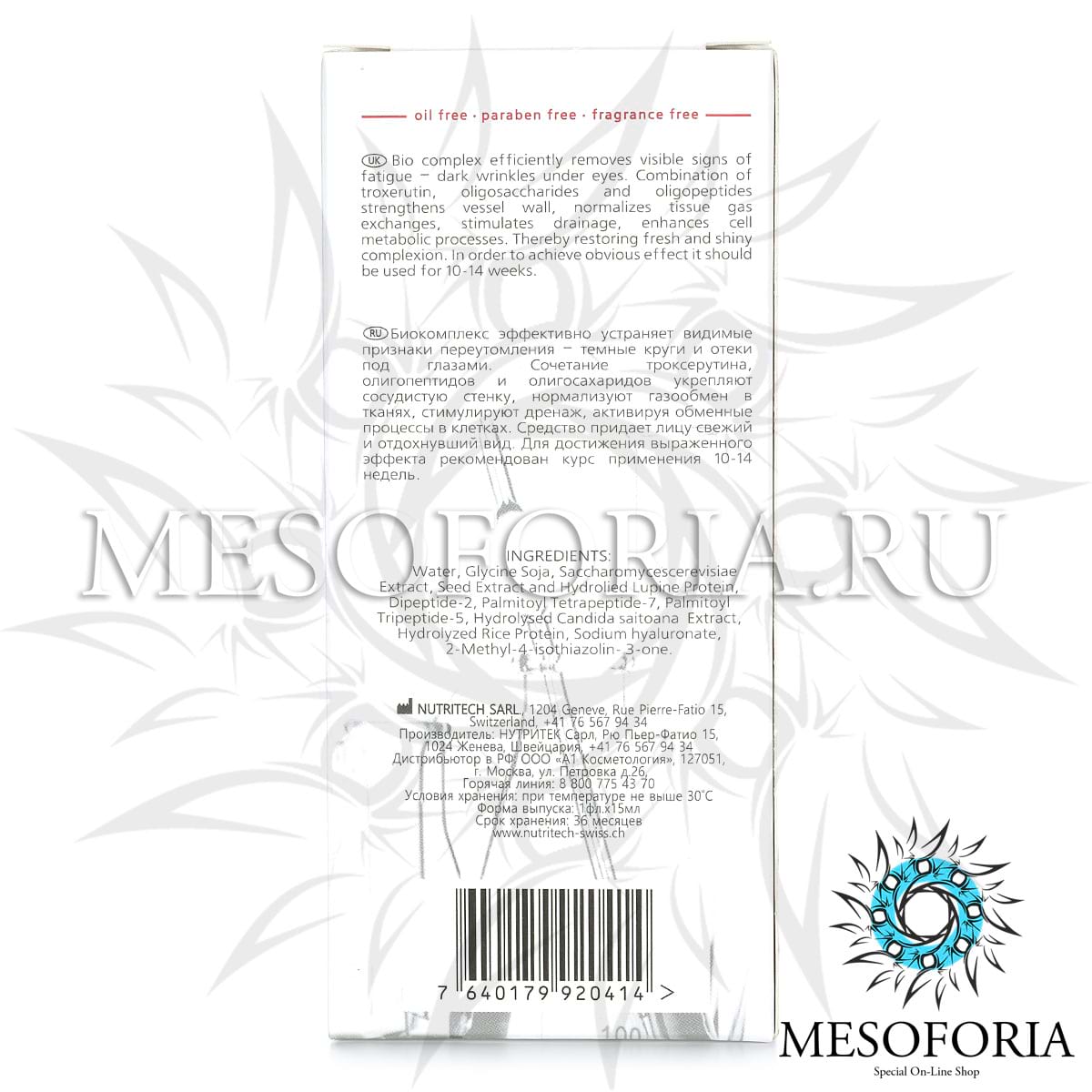 Биокомплекс эффективно устраняет видимые признаки переутомления – темные круги и отеки под глазами. Сочетание троксерутина, олигопептидов и олигосахаридов: укрепляют сосудистую стенку, нормализуют газообмен в тканях, стимулируют дренаж, активируя обменные процессы в клетках, средство придает лицу свежий и отдохнувший вид.