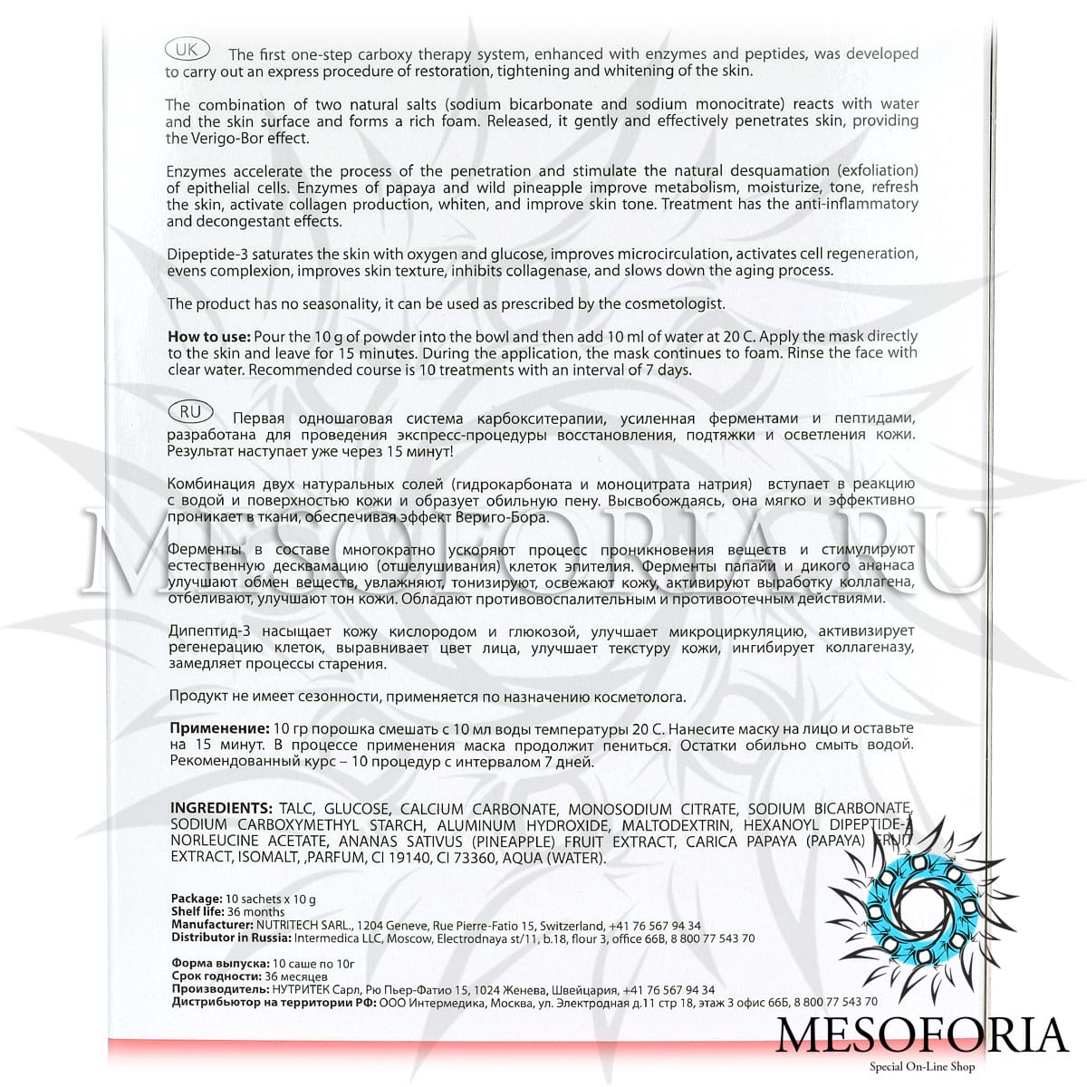 Дипептид-3 насыщает кожу кислородом и глюкозой, улучшает микроциркуляцию, активизирует регенерацию клеток, выравнивает цвет лица, улучшает текстуру кожи, ингибирует коллагеназу, замедляет процессы старения. Ферменты в составе многократно ускоряют процесс проникновения веществ и стимулируют естественную десквамацию (отшелушивания) клеток эпителия. Ферменты папайи и дикого ананаса улучшают обмен веществ, увлажняют, тонизируют, освежают кожу, активируют выработку коллагена, отбеливают, улучшают тон кожи. Обладают противовоспалительным и противоотечным действиями. Комбинация двух натуральных солей (гидрокарбоната и моноцитрата натрия) вступает в реакцию с водой и поверхностью кожи и образует обильную пену. Высвобождаясь, она мягко и эффективно проникает в ткани, обеспечивая эффект Вериго-Бора.