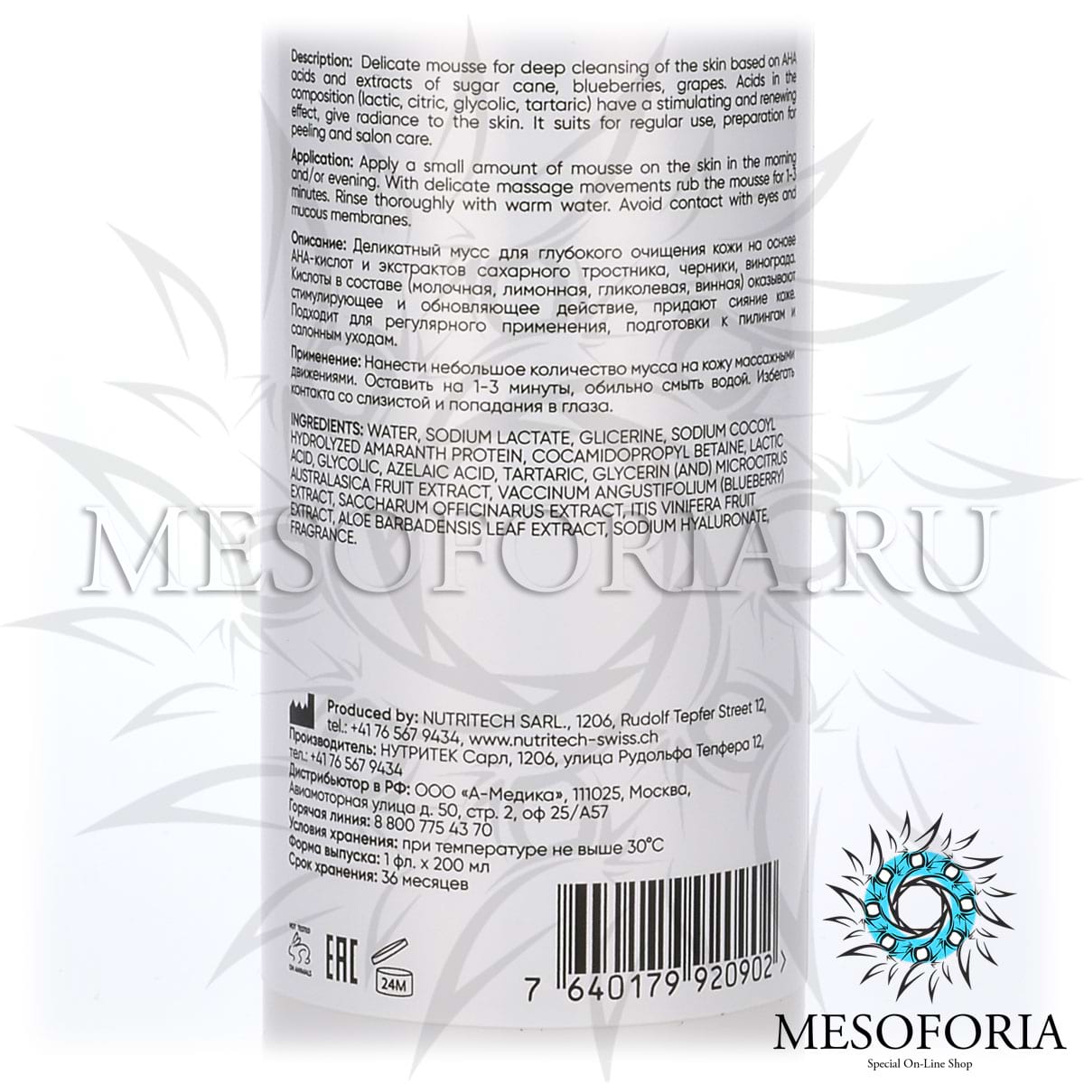 Мусс на основе АНА-кислот и экстрактов сахарного тростника, черники, винограда. Кислоты в составе (молочная, лимонная, гликолевая, винная) оказывают стимулирующее и обновляющее действие, придают сияние коже. Подходит для регулярного применения, подготовки к пилингам и салонным уходам.
