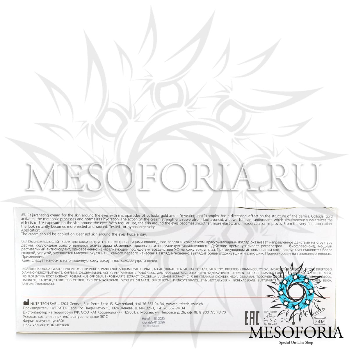 Омолаживающий крем для кожи вокруг глаз с микрочастицами коллоидного золота и комплексом «раскрывающим» взгляд оказывает направленное действие на структуру дермы.