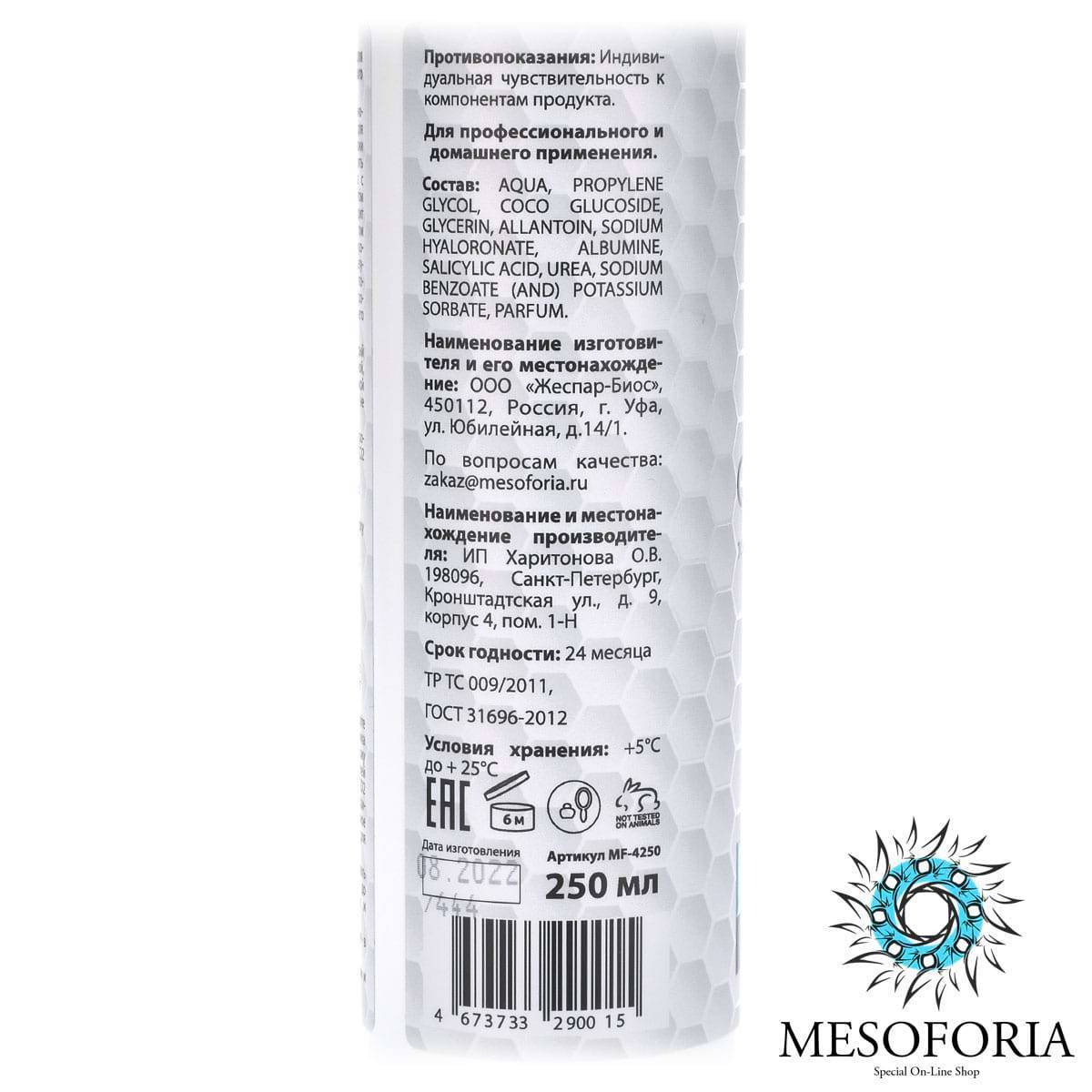 Расход на одну процедуру: на лицо 2-3 мл, на лицо+шея+декольте - 4-8 мл. Объем: 250 мл Дополнительно: Косметика MESOFORIA ™ (зарегистрированная торговая марка) производится по технологиям медицинских гелей. Эксклюзивная научная разработка компании MESOFORIA (г. Cанкт-Петербург) и ООО "Жеспар-Биос" (г. Уфа).Сертификат на препарат Вы можете найти в разделе «Сертификаты продукции».