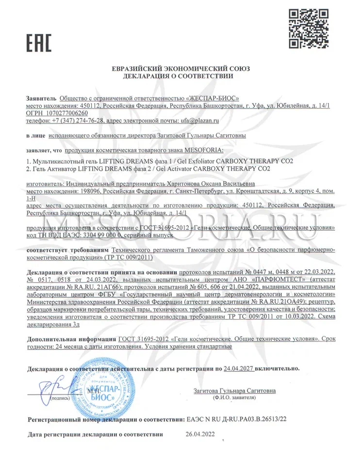 Дополнительно: Косметика MESOFORIA ™ (зарегистрированная торговая марка) производится по технологиям медицинских гелей. Эксклюзивная научная разработка компании MESOFORIA (г. Cанкт-Петербург) и ООО "Жеспар-Биос" (г. Уфа).Сертификат на препарат Вы можете найти в разделе «Сертификаты продукции».