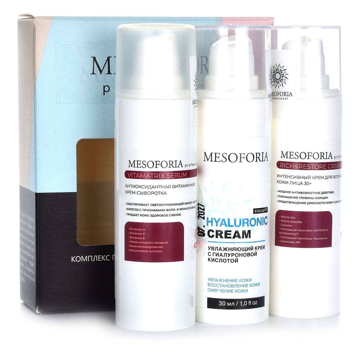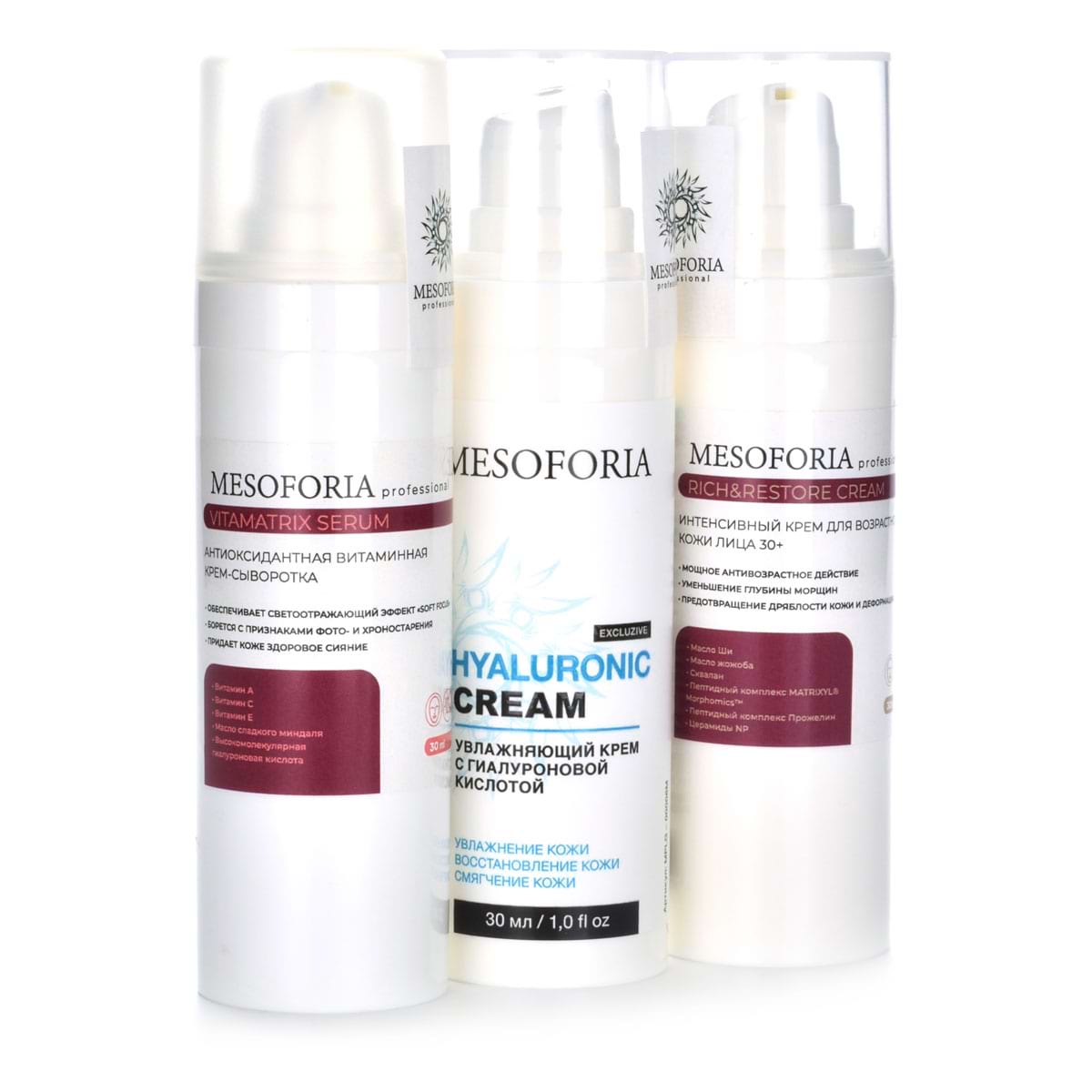 - VitaMatrix Serum, Mesoforia (Мезофория) – 30 мл - Антиоксидантная сыворотка с 5%-ным витамином С, находящемся в двух стабильных формах, таких как инкапсулированный в липосомах аскорбил пальмитат и аскорбил глюкозид. Также средство содержит ресвератрол 3% , феруловую кислоту 0,5%, ниацинамид 5%, фосфолипидный комплекс с дигидрокверцетином 3%. Средство обладает высокой концентрацией трёх самых мощных антиоксидантов — витамина С, ресвератрола и феруловой кислоты, которые придают ему омолаживающие и детоксицирующие свойства. Сыворотка разглаживает мелкие и глубокие морщины, осветляет тон кожи и снижает чувствительность.