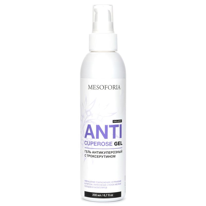 - Anticuperose Gel, Mesoforia (Мезофория) - 200 мл - Гель для чувствительной кожи против купероза содержит комплекс экстрактов: конского каштана, иглицы, центеллы азиатской, виноградных листьев, плюща, гречихи; а также троксерутин, гиалуроновую кислоту, витамины: PP, С и ДМАЕ. Это инновационное средство эффективно борется с расширенными сосудами, куперозом и покраснениями, а также помогает нормализовать состояние чувствительной кожи, подверженной телеангиоэктазиям и покраснениям.