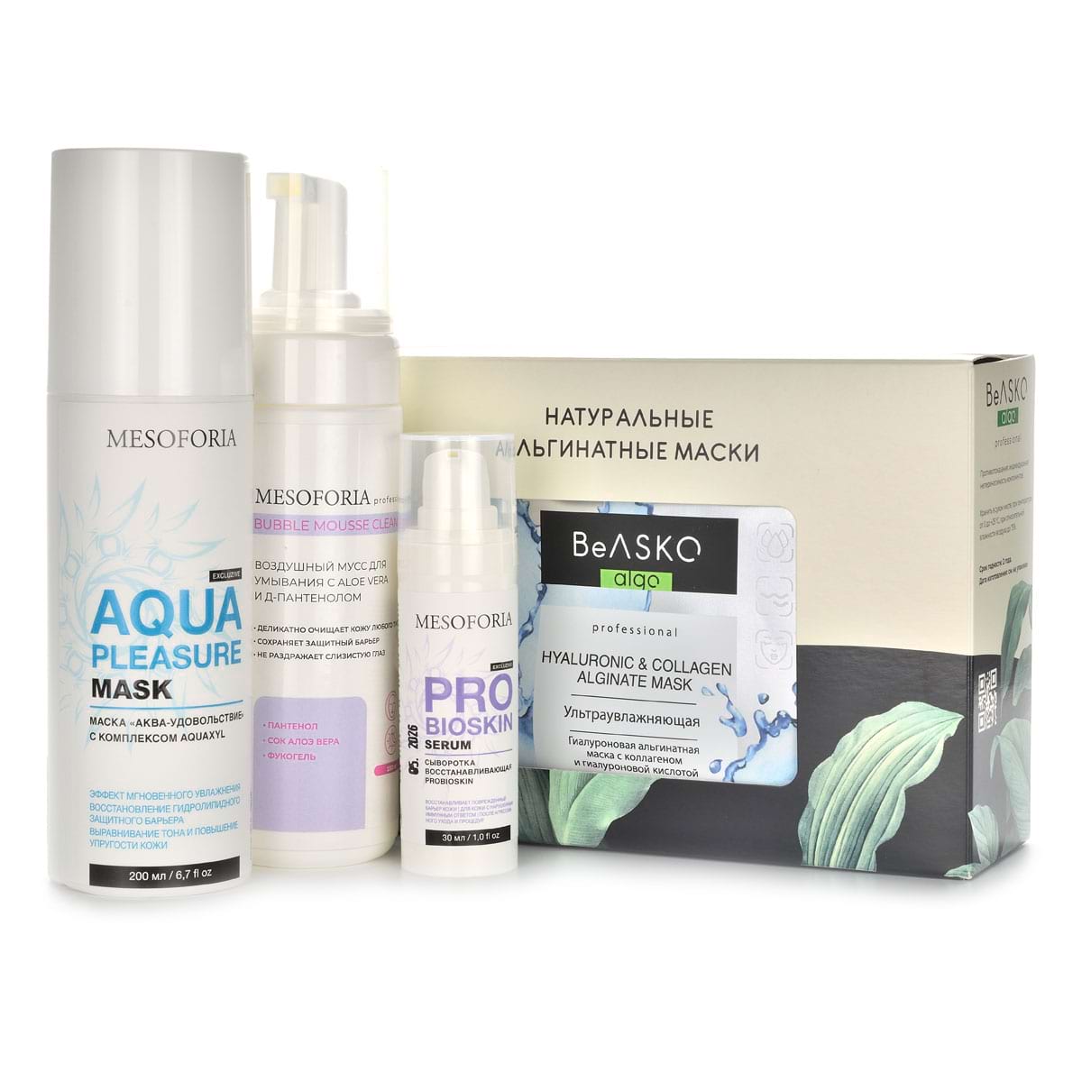 В состав набора входят:- Bubble Mousse Cleanser, Mesoforia (Мезофория) – 150 мл - Универсальный воздушный мусс для умывания с Aloe Vera и Д-пантенолом гель для нежного очищения и смягчения всех типов кожи. Гипоаллергенная формула, без сульфатов. Подходит для тонкой и чувствительной кожи с куперозом, для кожи, склонной к покраснениям и шелушению. Экономный расход, совместимость со всеми средствами линейки MESOFORIA.