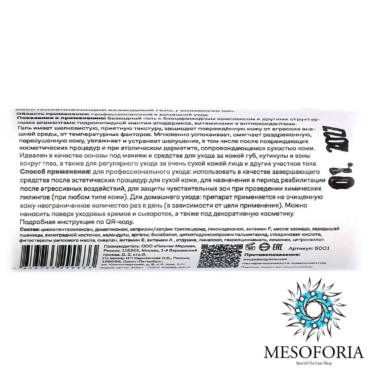 SkinSaver Gel / Восстанавливающий безводный гель с биоцерамиами после агрессивных процедур, Mesoforia (Мезофория) - 30 мл