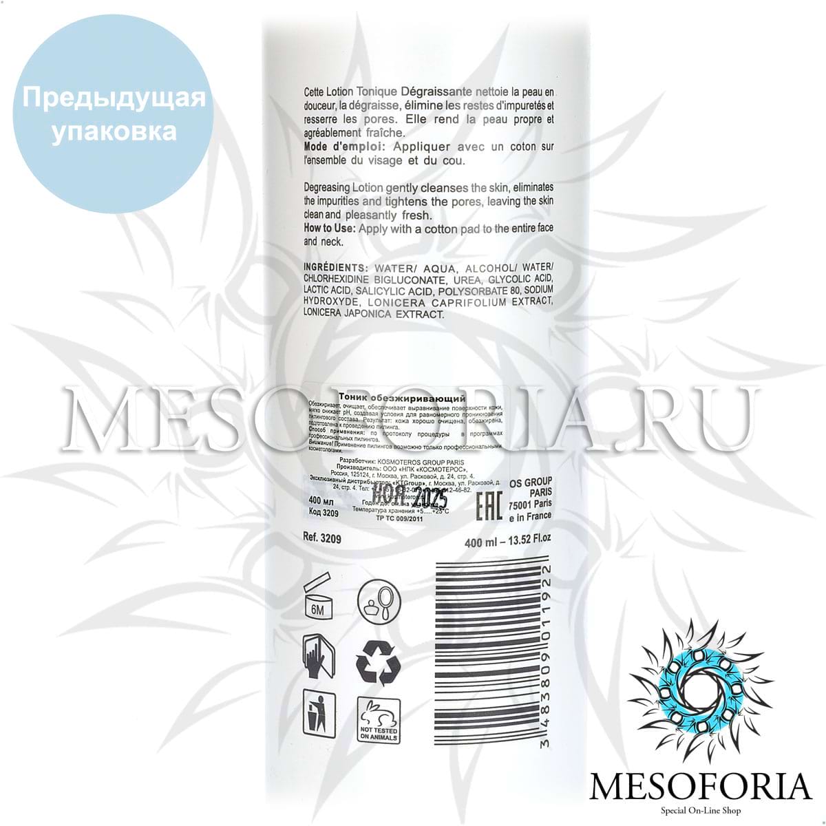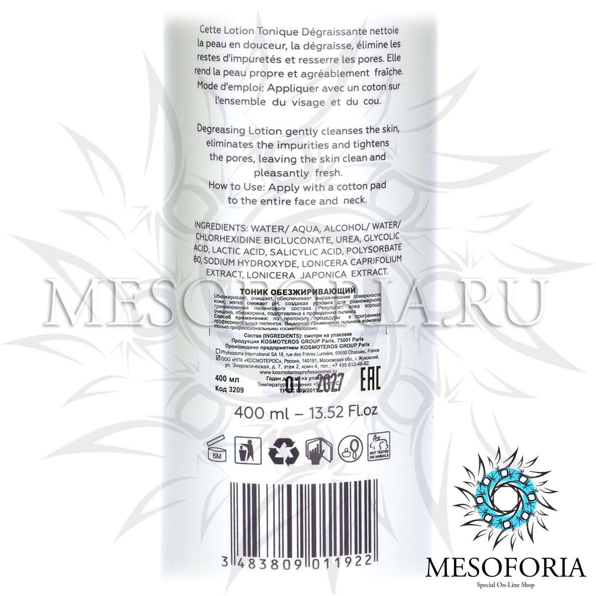 Обезжиривающий лосьон-тоник для подготовки кожи к химическому пилингу / Lotion Tonique Degraissante, Kosmoteros (Космотерос), 400 мл